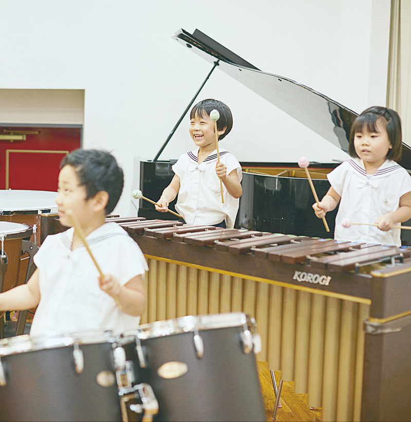幼少期の音楽体験は心身ともに健やかな成長につながります。 ハンドベル、マリンバ、日本太鼓等いろいろな楽器に親しみながら音楽性を高めます。幼少期の音楽から受ける影響はとても大きく、 言語能力や想像力を育んだり、豊かな感性を育む上で大きな役割を果たします。本園では、合唱だけではなく、専門教師による指導のもと器楽合奏にもチャレンジします。一曲を完成させるためにクラスみんなで協力しながら頑張ります。協調性や集中力も養われ、日々、子どもたちの心身の成長を感じることができます。練習した曲は運動会やクリスマス祝会などで披露しますが、地域の行事で演奏する機会もあり、近年では辻堂海浜公園で開催の「辻の盆」や「湘南キッズデイ」で披露させていただきました。 また、過去には成人の日の東京ディズニーランド ドリーマーズ・オン・ステージでの演奏も大成功をおさめました。