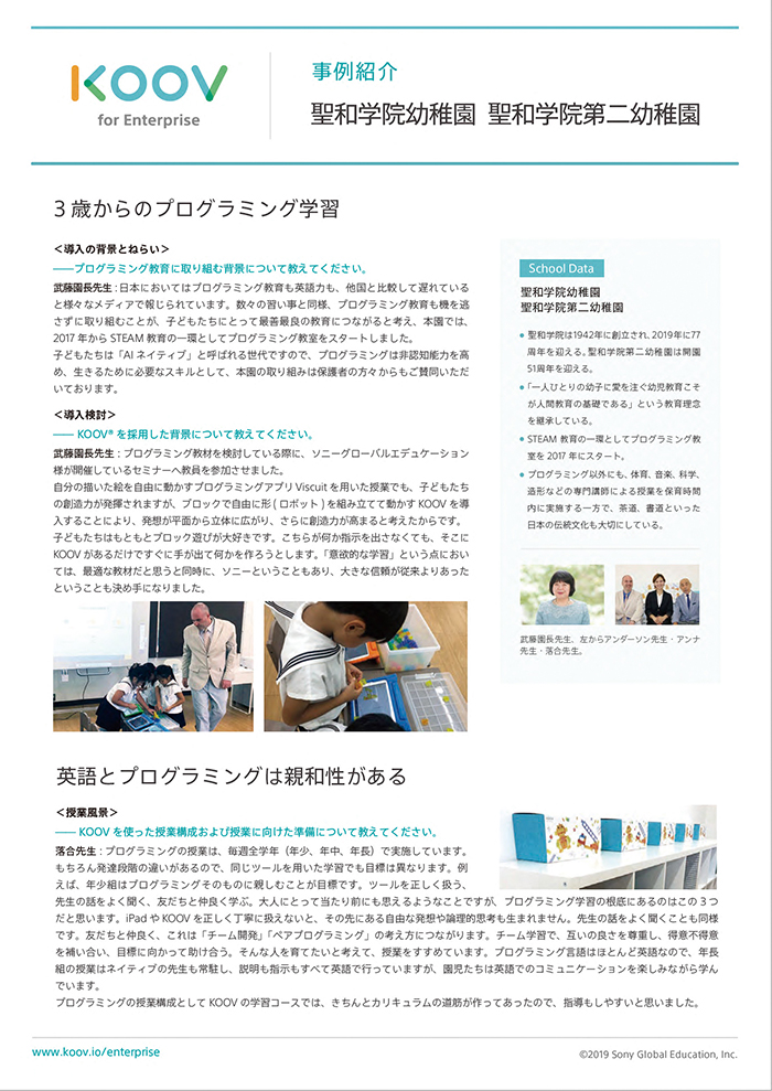 「聖和学院幼稚園は2017年からSTEAM教育の一環としてプログラミング教室をスタートしており、プログラミングの非認知能力を高め、生きるために必要なスキルとして積極的に取り組んでいる。KOOV®を導入し、 チームでの学習を通してお互いの良さを尊重し、得意・不得意を補い合い、目標に向かって助け合うような教育方針のもと授業を進めているという。」