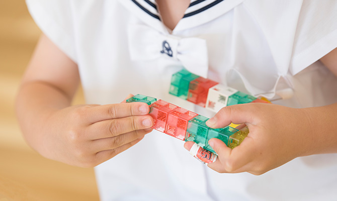 ソニーグローバルエデュケーションのプログラミング学習キット「KOOV®(クーブ)」を採用しています。ブロックを自由に組み立ててロボットを作り、LEDランプやDCモーターと合わせて光や回転等さまざまな動きを与えて遊びます。 この楽しい体験を通じて、子どもたちの探究心、創造力、思考力を育みます。オンラインで世界中の子どもたちと作品をシェアしたり、コミュニケーションをとることもできるため、視野が広がり、小学校のプログラミング学習にも役立ちます。 尚、コロナによる休園の際には、オンライン授業も子どもたちに大人気でした。