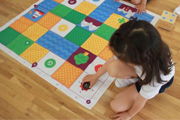 PRIMOS TOYS キュベットを使ったレッスンでは、マップを活用して方角や座標軸の考え方を英語で学びます。