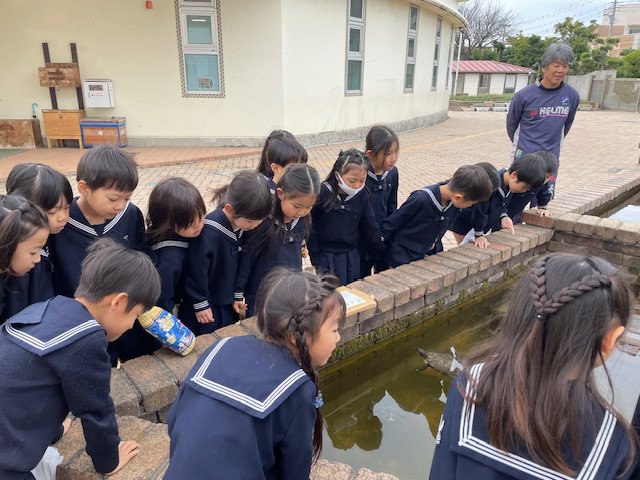 写真は、校内の池にいる亀をみんなで観察している1枚。