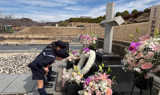 本日は『創立者 武藤功記念礼拝』。鎌倉霊園にて、園児たち一人ひとりがカーネーションを献花しました。